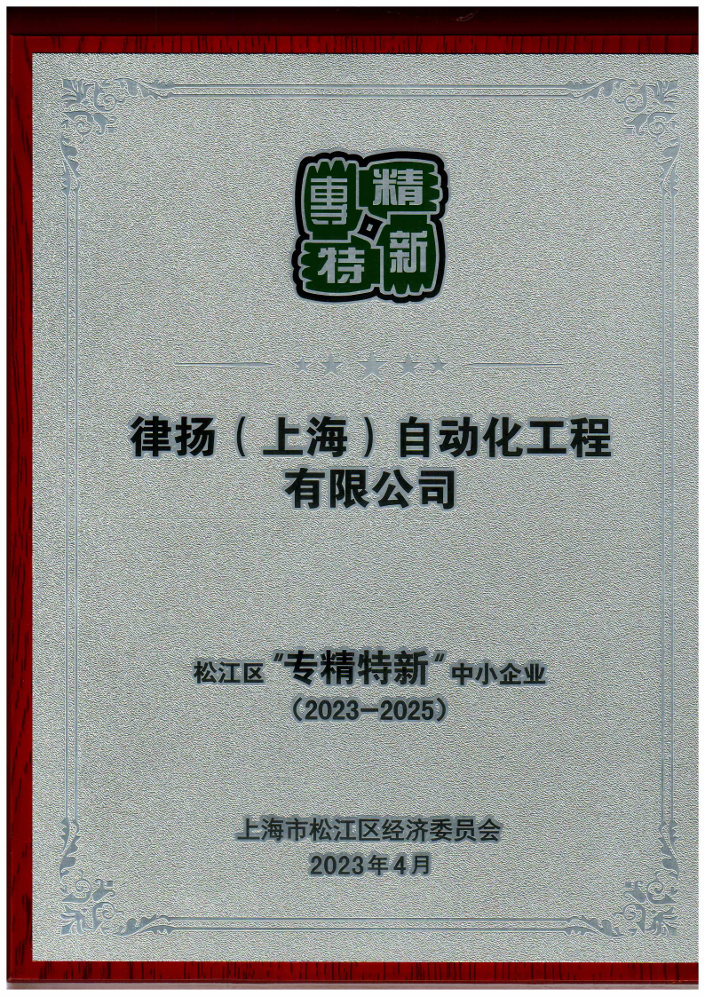 律扬(上海)自动化工程有限公司再次通过上海市松江区专精特新中小企业认证热烈庆祝律扬(上海)自动化工程有限公司再次通过上海市松江区专精特新中小企业认证并获得铜牌证书。 律扬定不辜负社会各界的认可,在专和精的领域更加精进,再接再厉,用更好的产品和服务回馈社会!